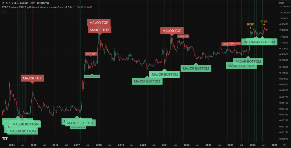 The AZRO Systems XRP Top/Bottom Indicator is a research tool to support cycle‑oriented execution and risk management. For educational purposes only; not investment advice. Past performance does not guarantee future results. Trading involves risk.